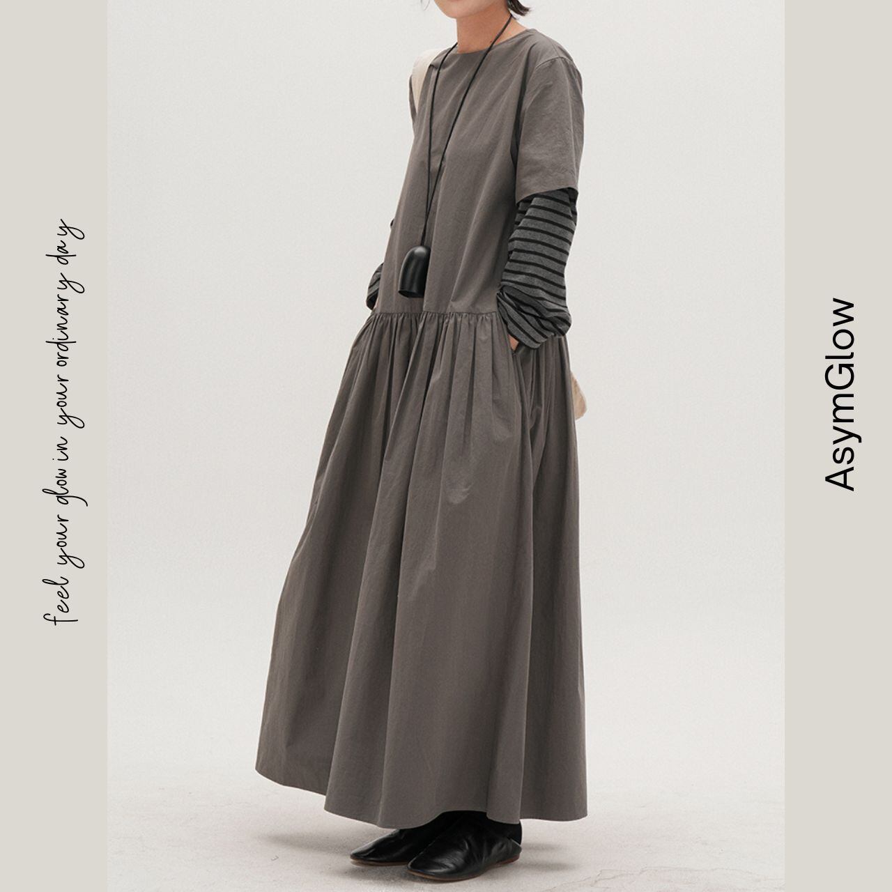 ギャザー切り替えがポイントのマキシ丈ワンピース。