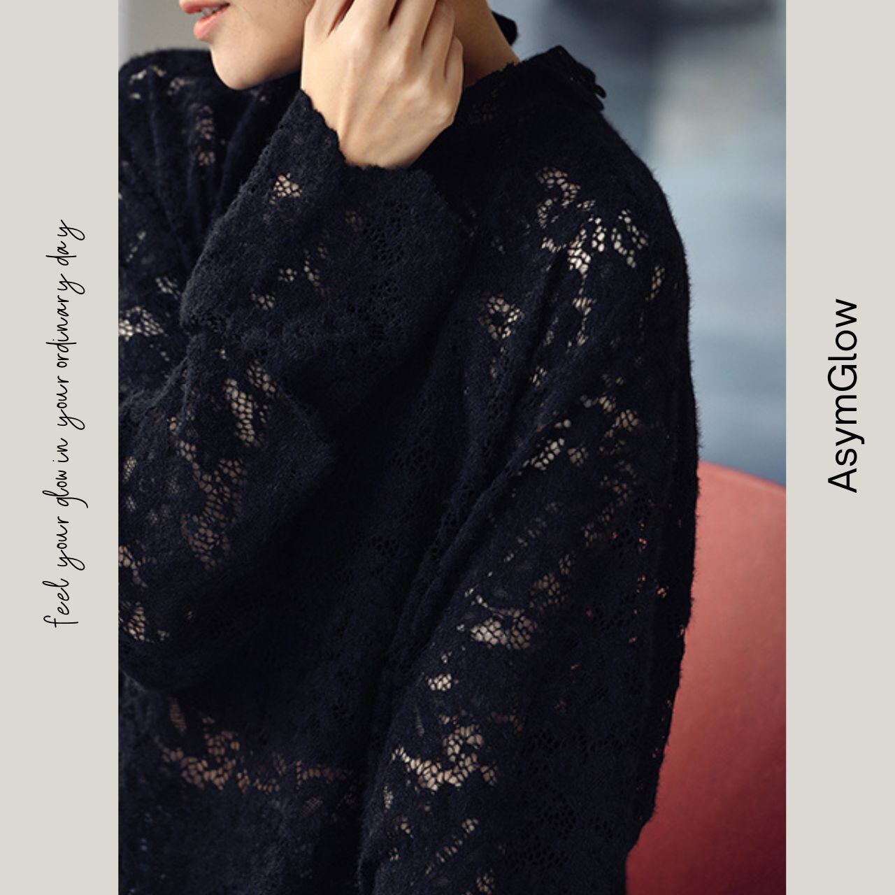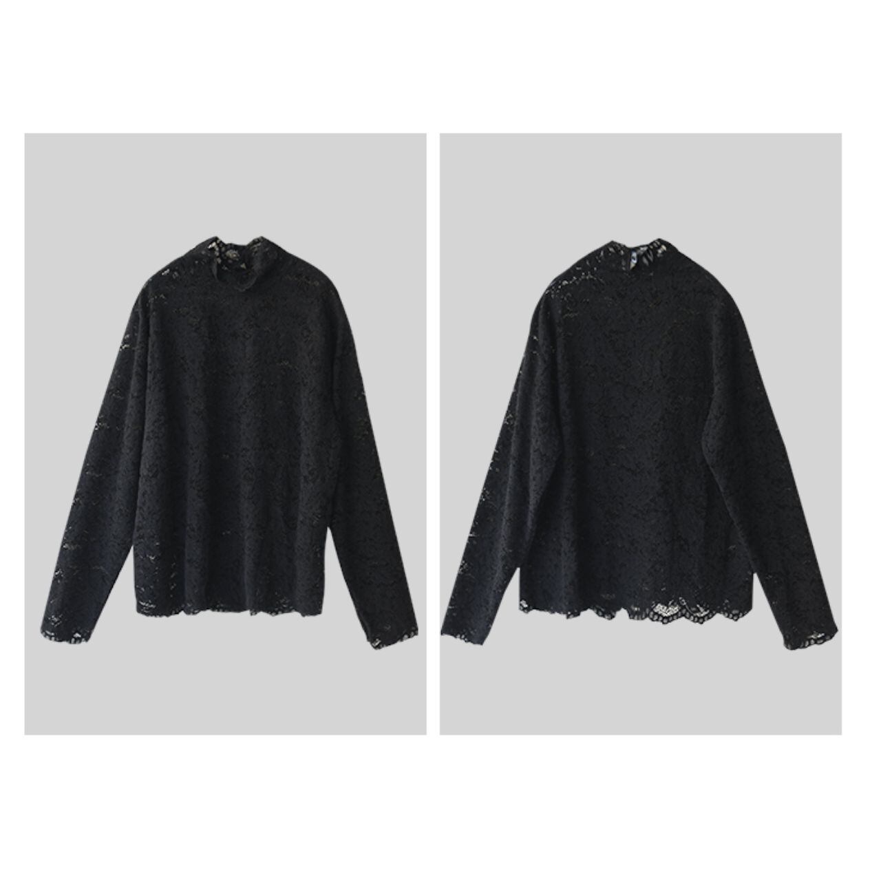 スタンドネックが上品な印象を添える長袖レースブラウス。