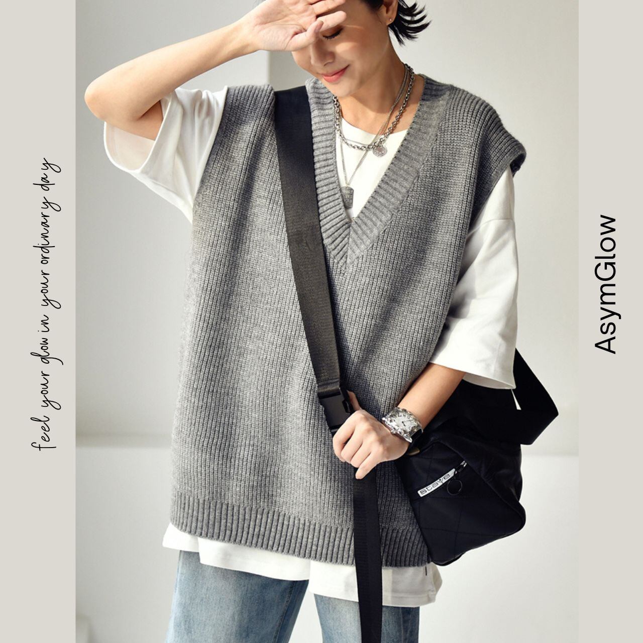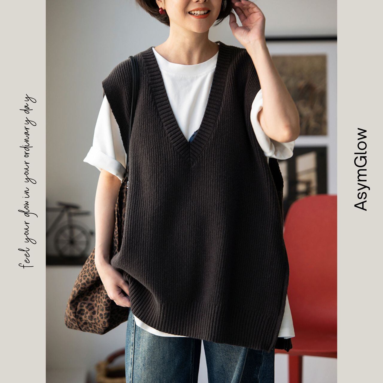 深めのVネックがシャープな印象を与える、オーバーサイズニットベスト。
