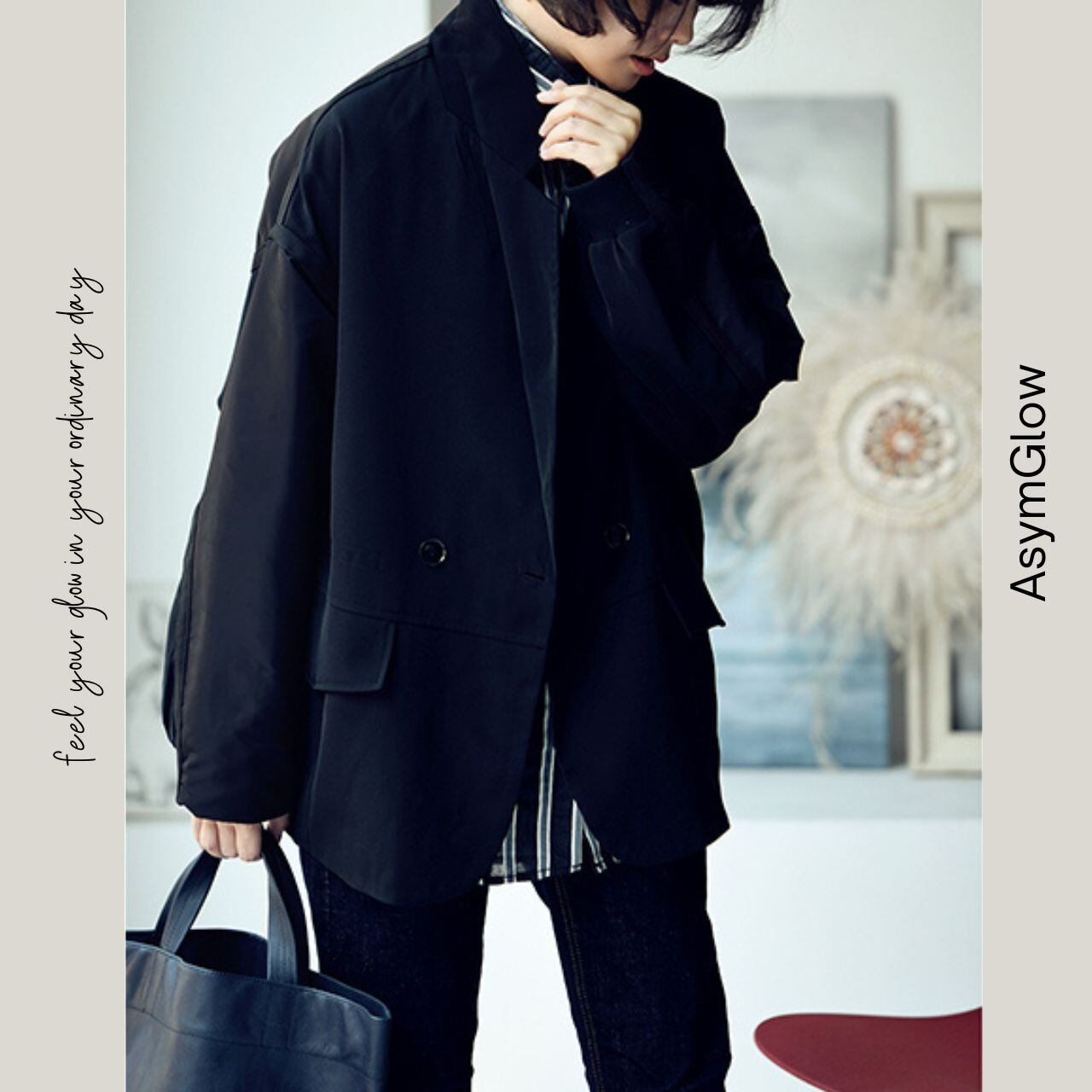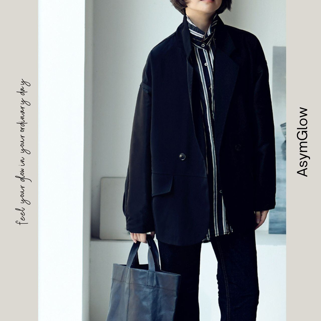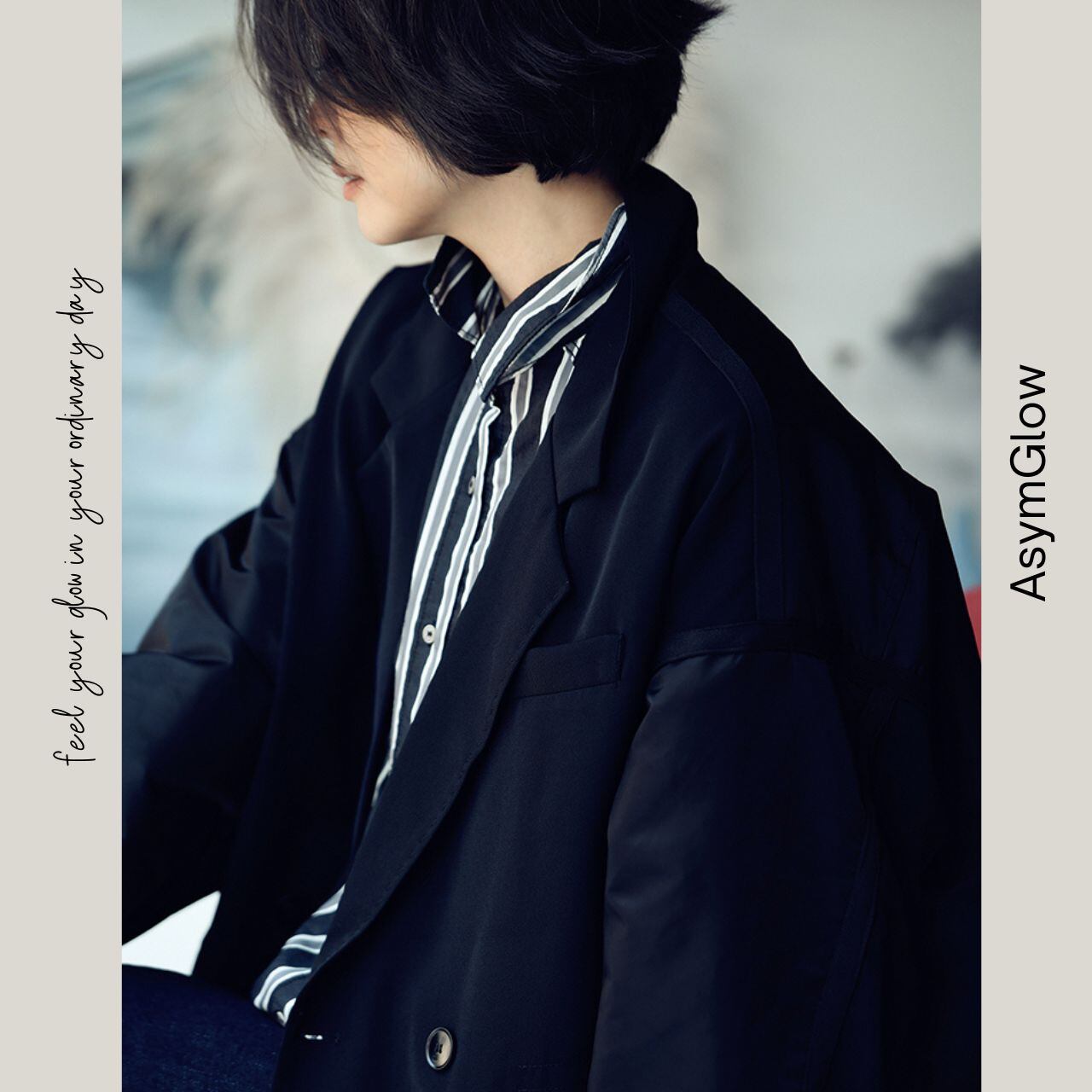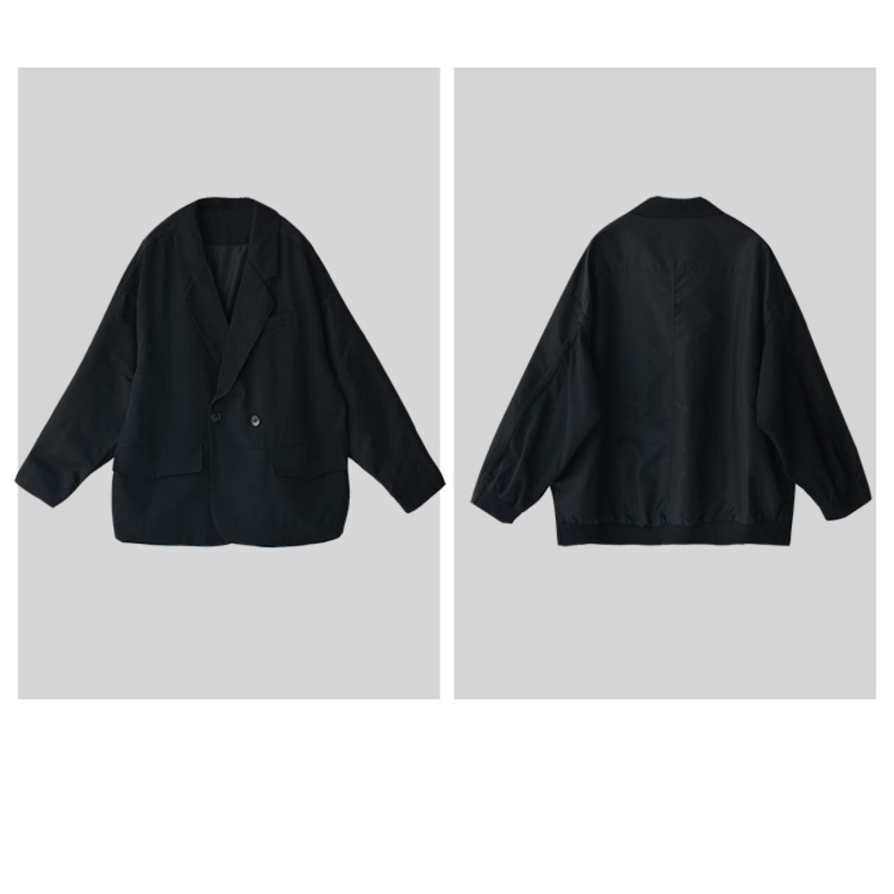 ダブルブレストのデザインが特徴的なヒップ丈ジャケット。