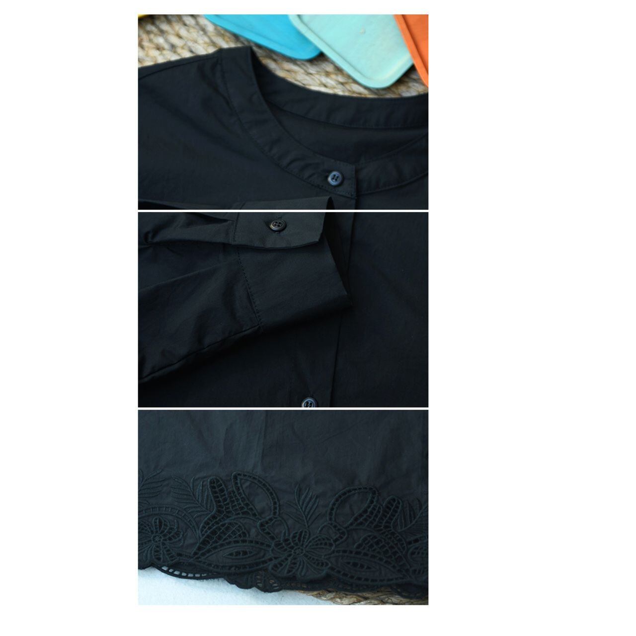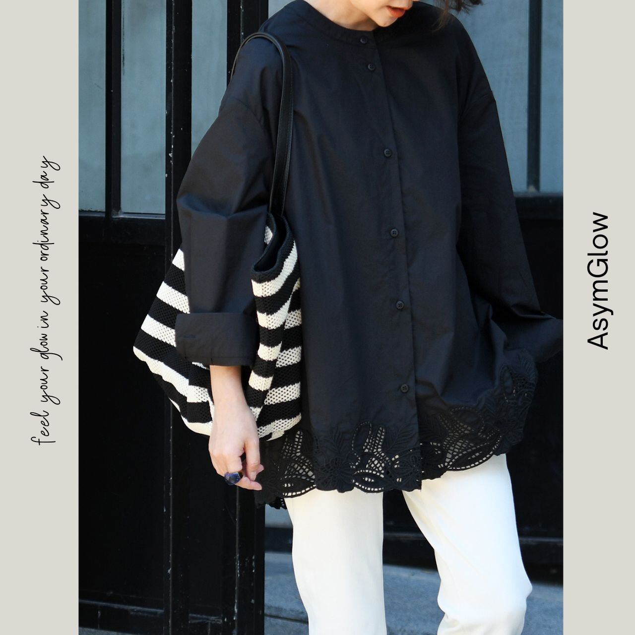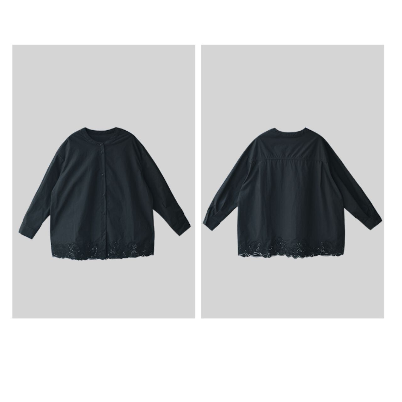 裾のレースがさりげないアクセントになった長袖シャツ。